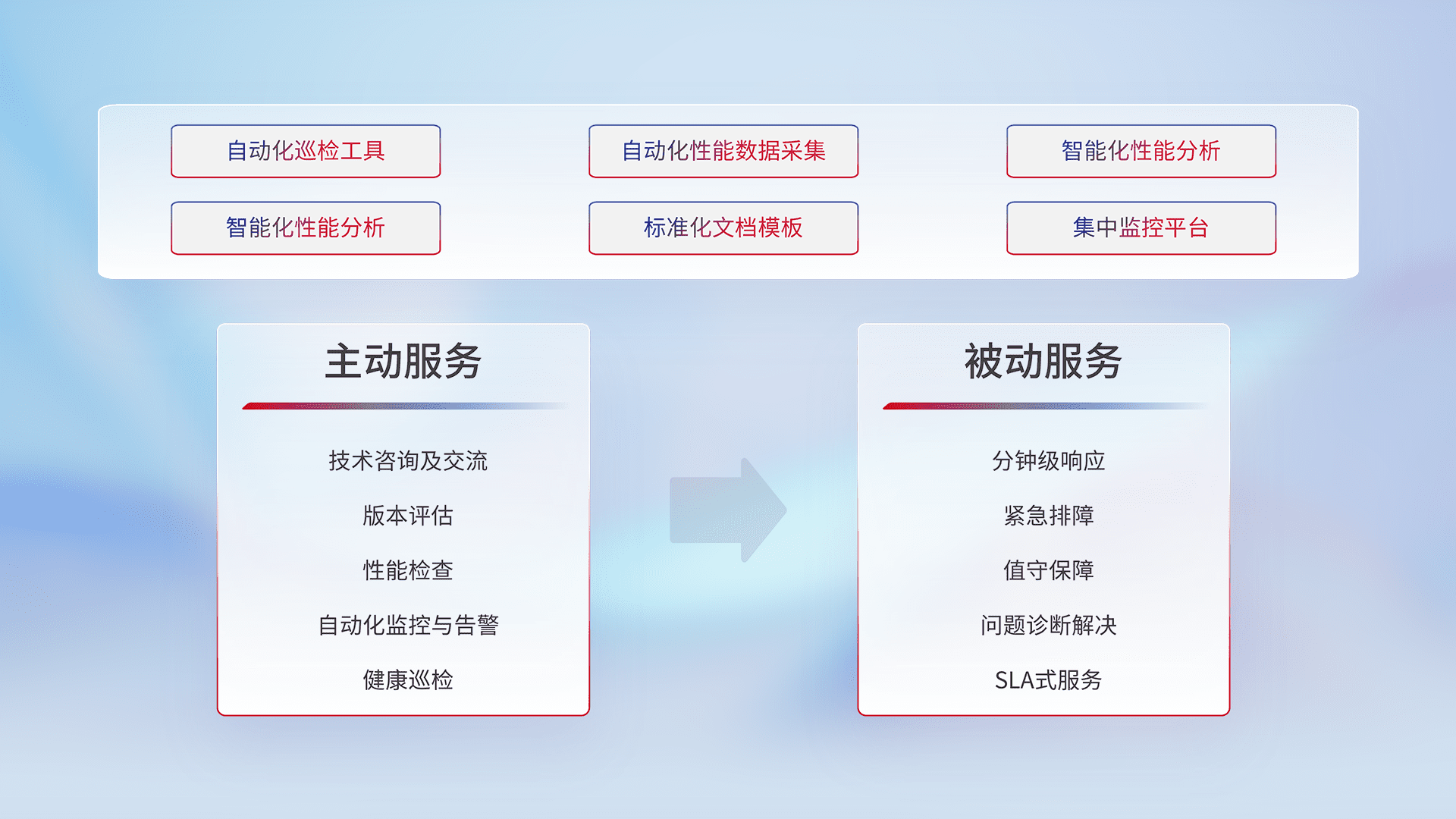 智能化工具和标准化文档,,,,保障服务质量,,,,提供主动服务(包含技术咨询、、、、版本评估、、、、性能检查、、自动化监控与告警、、健康巡检)和被动服务包含(分钟级响应、、紧急排障、、、、值守保障、、、、问题诊断解决、、SLA服务)。。。